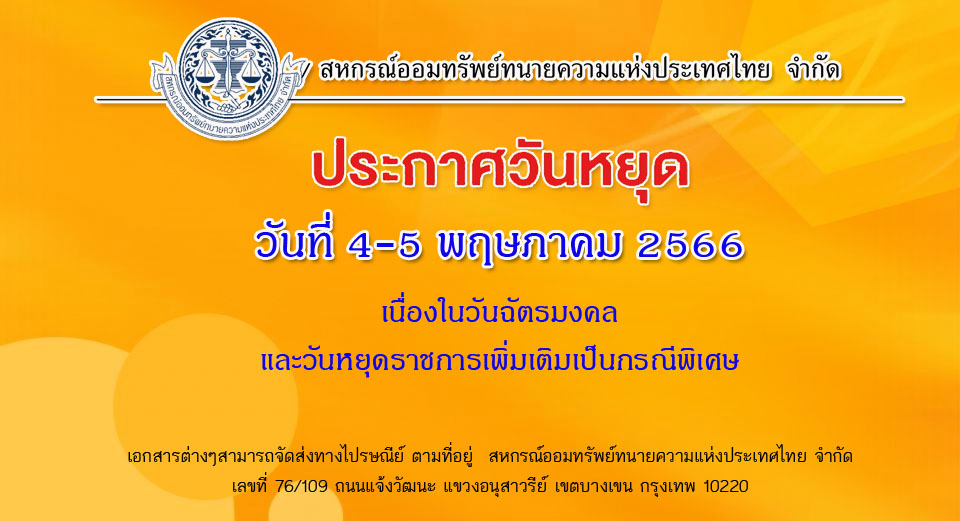 ขอเรียนเชิญสมาชิกสหกรณ์ออมทรัพย์ทนายความแห่งประเทศไทย จำกัด ทุกท่านเข้าร่วมประชุมใหญ่สามัญประจำปี 2567